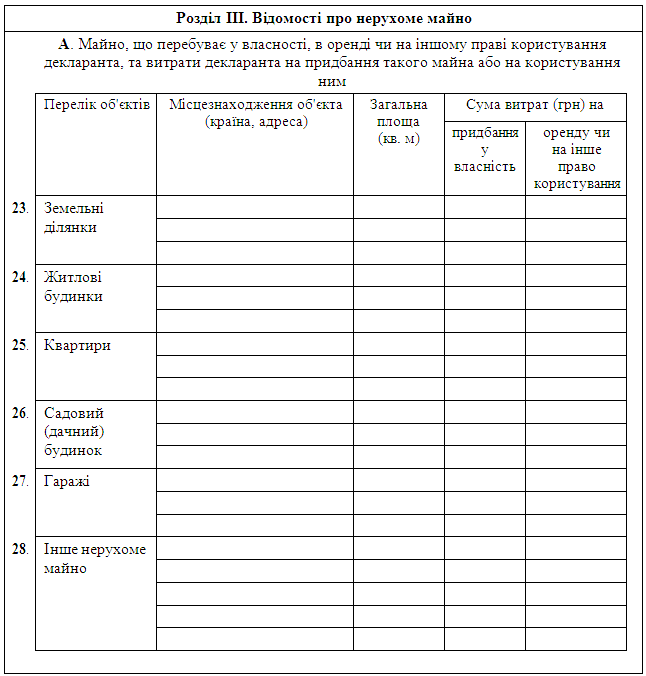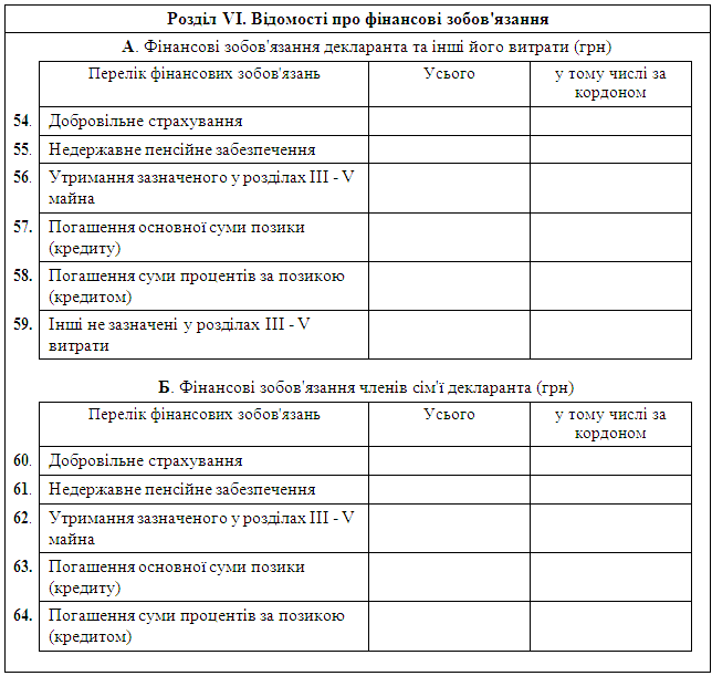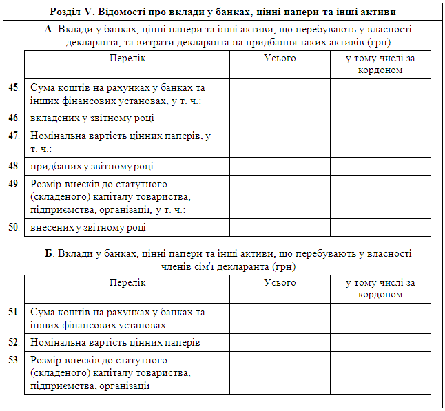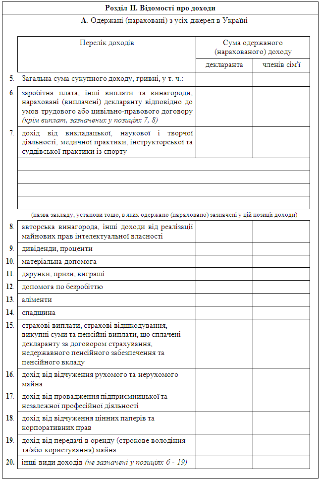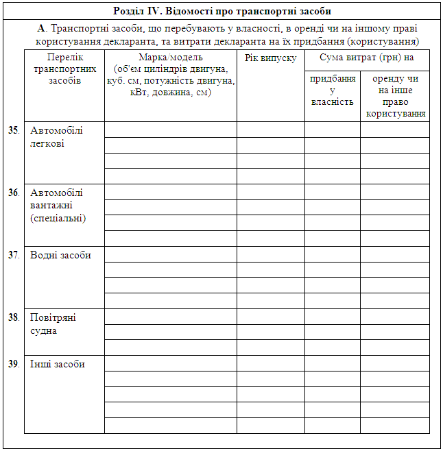 Примітка. 1. Декларація заповнюється і подається особами, зазначеними у пункті 1 і підпункті "а" пункту 2 частини першої статті 4, та особами, зазначеними в абзаці першому частини першої статті 11 Закону України "Про засади запобігання і протидії корупції". При цьому особами, зазначеними в абзаці першому частини першої статті 11 цього Закону, відомості щодо витрат (вкладів/внесків) у декларації не зазначаються.